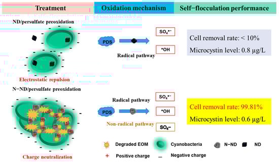 Using ferrous ions as the catalyst for persulfate to enhance the coagulation of Microcystis-laden water has also been reported [,], but after pre-oxidation and coagulation with Fe2+ and PDS, 9.3% of Microcystis cells are reported to remain in the water []. With 20 mg/L of PMS and 4.5 mg/L Fe2+, that can be reduced to 5.7% []. Note that Fe2+ can serve not only as a catalyst for persulfate but also as a coagulant in Microcystis removal without adding a conventional aluminum flocculant []. But the system tested here showed more complete removal with only 0.2% remaining after 120 min. N-ND can apparently be used as a substitute for iron ions in catalyzing PDS and as a coagulant to promote sedimentation.