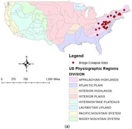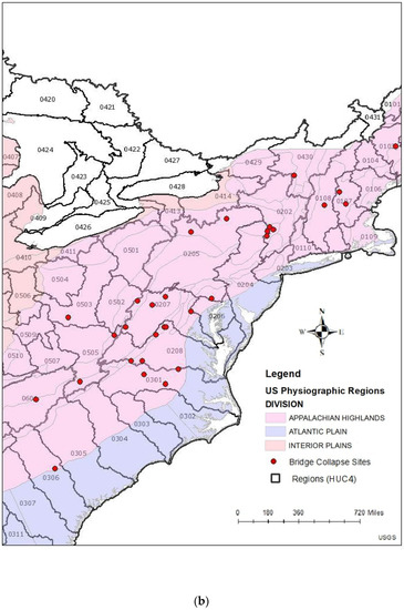Thirty bridge collapse sites within the Appalachian Highland region in the U.S. (a) Location of sites in the U.S.; (b) Location of sites within the Appalachian Highland region with watershed boundaries (with HUC 04 ID).