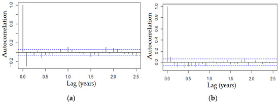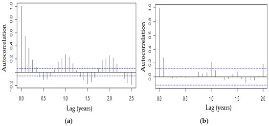 For all sites, significant autocorrelations are found at multiple lags (Figure 2), which can be expected for monthly flow data. For most of the sites (twenty out of thirty sites), the derived autocorrelations reflect both significant positive and negative linear relationships between pairs of variables separated by different lags (Figure 2a, Table 6), which implies that higher flows tend to occur in the specific months followed by lower flows in the consecutive months. It is worth looking for significant values at significant lags (Table 6), i.e., the annual cycle (lag 1 or twelve months) and seasonal period (lag 0.5 or six months). For all sites except one, the annual cycle appears with a significant positive correlation at one year in the correlogram (Table 6). This reflects a significant positive linear relationship between pairs of flow values (xt, xt+12) separated by twelve-month periods. Conversely, values separated by a period of six months tend to have a significant negative relationship for most sites (twenty out of thirty sites) (Table 6). Higher values tend to occur in the summer months, followed by lower values in the winter months. A significant negative correlation, therefore, occurs at a lag of six months (or 0.5 years). The maximum significant correlation is found at lag 0.1 (1 month) for twenty-five out of thirty sites. The significant autocorrelation at one month (Table 6, Figure 2a,b), which is found for all sites, generally implies an increasing trend over the period of the flow data [63]. Another marginal piece of evidence of a trend can be discerned from the correlogram. If a trend is present in the data, it will show as a slow decay in the autocorrelations in the correlogram [63]. The data in Figure 2a provides somewhat marginal evidence of the slow decay in the autocorrelations, which holds true for most of the sites. The available monthly flow data at all sites are found to be stationary, rejecting the null hypothesis of non-stationary data (p-value < 0.1) (Table 6).