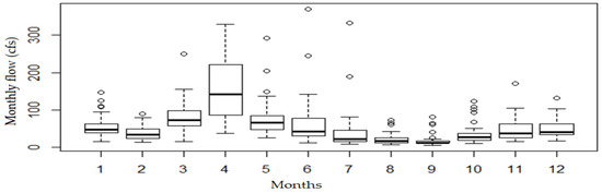 The boxplot summarizes the observed values for each season; an example is provided in Figure 3. The presence of outliers for both summer and winter months is evident in the derived boxplot (Figure 3). A tendency for higher flows over the summer months is also evident in the boxplot (Figure 3). The presence of outliers over several months holds true for all of the studied sites. The derived correlograms and boxplots for all sites can be accessed at https://github.com/fahmidah/Challenges-in-Hydrologic-Extremes/tree/main/Correlogram%20and%20Boxplot (accessed on 20 January 2023).