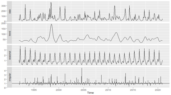In Figure 4, the trend cycle has captured the peak in the data that occurred in the month of June 1998. No obvious deterministic trend (upward or downward) is detected for the data series (Figure 4). For the seasonal component, it decreases at the beginning of the period, then remains somewhat constant for some period of time, and finally increases at the end of the time period (Figure 4). The constancy of the seasonal component implies additives, and variation in the seasonal component implies a multiplicative process. For all sites, the decomposed series reveals the absence of any monotonic deterministic trend and the presence of both additive and multiplicative seasonal variation. An additive process is one in which the effect of one variable on another is constant or fixed. A multiplicative process, on the other hand, is one in which the effect of one variable on another is proportional or changes with the level of the variable. A physical system with both additive and multiplicative processes can possess a combination of phenomena that have different effects on the output or behavior of the system. For the decomposition series in Figure 4, the unusual observation (peak flow) in 1998 can be clearly seen in the irregular component of the decomposition. Each irregular monthly observation requires a detailed investigation, which is outside the scope of the current study. The derived decomposed series for all sites can be accessed at https://github.com/fahmidah/Challenges-in-Hydrologic-Extremes/tree/main/Decomposition (accessed on 20 January 2023).