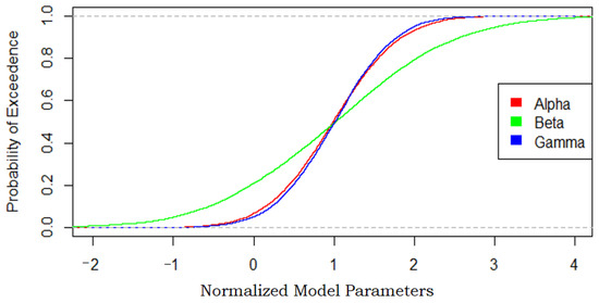 Hypsometric curves of normalized Holt-Winters model parameters (α, β, and γ).