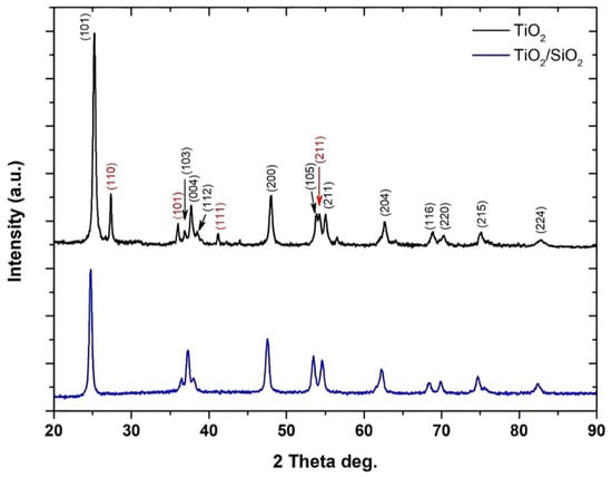 XRD pattern for the prepared TiO2/SiO2 (7:1) powder. The crystal planes presented in black correspond to the TiO2 anatase phase, while the crystal planes presented in red correspond to TiO2 rutile phase. The XRD pattern of pure TiO2 is presented as reference.