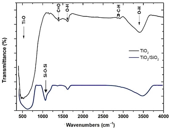 The broad absorption band present in the 400–1000 cm−1 region is ascribed to the Ti–O stretching of the Ti–O–Ti linkages within TiO2’s particles [36]. The peak at 1390.27 can be attributed to the asymmetric stretching mode of Ti-carboxylate [37]. Additionally, the peak spotted at 1622.87 cm−1 and the wide band between 3200 and 3600 cm−1 represent the O–H bending and stretching modes of hydroxyl groups respectively, verifying the existence of moisture in the studied powder [38]. Two weak bands present at 2852.84 and 2919.08 cm−1, in the case of pure TiO2, are associated with the characteristic frequencies of residual organic species emanating from the utilized precursors during the synthesis that were not completely eliminated after rinsing the as-prepared TiO2 powders with distilled water. Thus, the aforementioned bands can be attributed to C–H stretching vibrations of alkane groups [37]. As for the composite powder, the strong and dominant absorption peak spotted at wave number 1102–1105 cm−1 can be attributed to the asymmetric stretching vibration of the Si–O–Si (siloxane) bond [39].