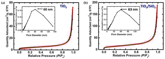 N2-sorption diagrams of (a) pure TiO2 powder and (b) TiO2/SiO2 composite powder, as indicated (sorption: black line; desorption: red line). Insets show pore size distributions by the BJH method.