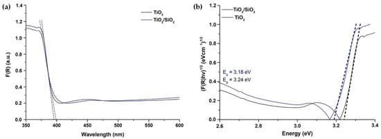 The determination of the energy band gap (Eg) is an important factor to be taken into account when conducting studies on photocatalysis. Figure 5a illustrates the diffuse reflectance spectra (DRS) of the TiO2/SiO2 composite powder as well as of pure TiO2.