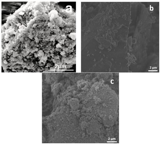 The morphology of the synthesized nanomatrials was observed by using FESEM. Figure 6 indicates that while TiO2 has a rugged morphology and many agglomerates (Figure 6a), SiO2 appears to have a smoother and flatter surface and a kind of prism-shape morphology (Figure 6b). The texture of the composite material (Figure 6c) seeems to have been refined compared to either TiO2 or SiO2 nanoparticles with smaller particles and aggregates. Babyszko et al. found results that are in accoradnce with our SEM analysis [46].