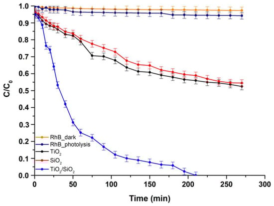 The photocatalytic efficiency of the composite TiO2/SiO2 powder sample was initially evaluated by measuring its ability to degrade RhB dye in an aqueous solution upon visible-light exposure. The photocatalytic tests were conducted at ambient temperature (25 °C) and pH value of 6.63 ± 0.01. In Figure 7, the photocatalytic performance of the tested composite powder is presented. To assess the enhancement of the composite’s photocatalytic efficiency under visible-light irradiation, pure TiO2 and SiO2 were included as references along with the composite sample. Control experiments were also performed, including photolysis (RhB photolysis) as well as adsorption–desorption equilibrium (RhB dark), without light irradiation but under constant stirring for the same duration as the photocatalytic process. The results indicated that less than 1% of RhB was degraded upon visible-light irradiation, showing that the degradation rate of RhB without the presence of the tested powders was extremely low. Additionally, consistent outcomes were obtained from the experiments conducted in the dark state, confirming the stability of the dye [16].