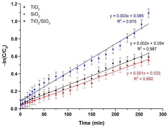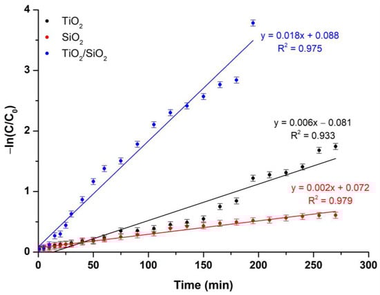 The kinetic model studies upon visible-light irradiation revealed data that are depicted in Figure 14, showing the relationship between the variation of -ln(C/C0) towards time for the studied composite powder. Phenol photocatalytic rate absorption on the surface of the powders is increased in the case of the composite powder compared to pure TiO2 and SiO2, as indicated by the pseudo-first-order kinetics (0.003 min−1) that can be described through Equation (11) (see Table 10).
