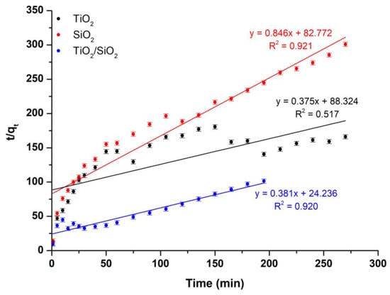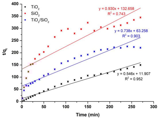 Kinetics were also studied according to the pseudo-second-order kinetic model (Equation (12)), and the results are presented in Figure 15.