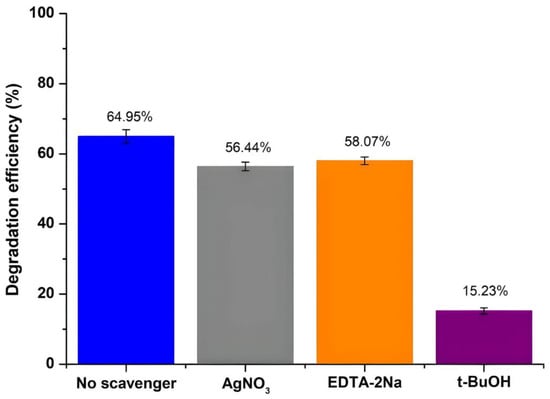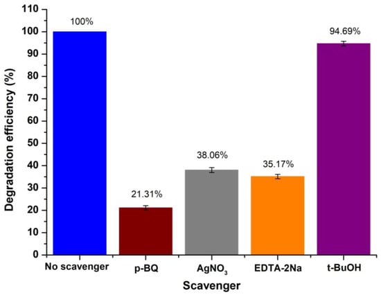 Thorough investigations were also realized to identify those active species actually involved by focusing on the verification of the proposed photocatalytic mechanism for phenol degradation. Similarly, to the case of RhB, a series of experiments took place for scavenging and capturing the specific species. However, given the fact that p-BQ constitutes an ●O2− radical scavenger, as mentioned above (see part 2 in Section 3.2.1), as well as an intermediate product of phenol degradation, ●O2− radical scavenging trials were excluded in order not to affect the HPLC measurements. As a result, AgNO3, EDTA-2Na, and t-BuOH were introduced into the phenol solution and utilized to selectively trap and identify electrons (e−), holes (h+), and hydroxyl radicals (●OH), respectively.