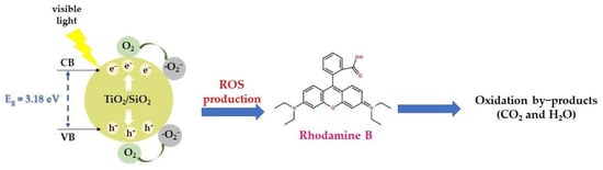 The effectiveness of the visible-light photocatalytic activity of the as-synthesized TiO2/SiO2 composite was initially examined towards RhB degradation using 0.005 g of the composite in 10 mg·L−1 RhB (C28H31CIN2O3, Penta-Chemicals Unlimited, Prague, Czech Republic) aqueous solution (250 mL) at ambient temperature and pH equal to 6.63 ± 0.01. Before each of the photocatalytic experiments (cycles), saturation of RhB solution for 1h was performed through extra-pure O2 (99.999%) flow.