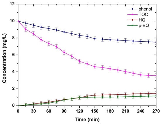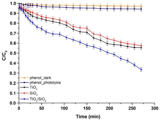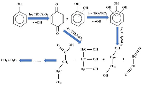 Furthermore, the present study aimed to shed light on the photocatalytic degradation mechanism of phenol under visible-light irradiation, particularly by quantitatively analyzing certain phenol intermediates (p-benzoquinone and hydroquinone) using the fabricated TiO2/SiO2 composite catalyst. It is noteworthy that, to the best of the authors’ knowledge, the complete understanding of the photodegradation mechanism of phenol and its derivatives under visible-light irradiation has not been established until now.