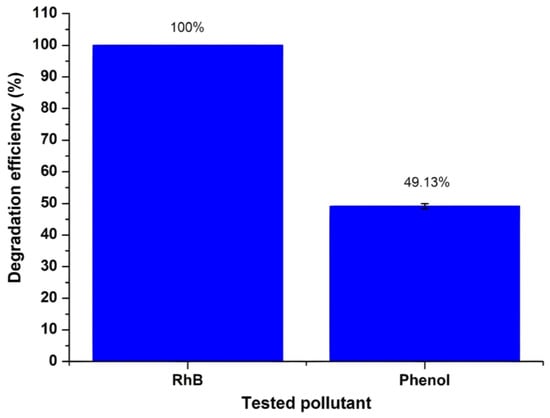 According to photocatalysis mechanism study, ●O2−, h+, and e− were suggested to constitute the major ROS species responsible for RhB’s photodegradation under visible-light irradiation, potentially indicating a hole/electron pair recombination suppression mechanism. In the case of phenol, corresponding study and experimental data proved that ●OH radicals comprised the active species associated with its photocatalytic degradation.