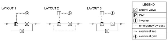 For each layout, different operating conditions have been identified. In LAY1, hydraulic regulation is performed using two lines, namely a generation line having a PAT and a PRV, and a bypass line having only a PRV. To ensure the desired pressure at the critical node, the residual available head that exceeds the head exploited by the PAT is dissipated by the downstream PRV in the generation line, as the PAT operates according to its characteristic curve. The bypass line is designed to open only when the available head drop is less than the required head drop of PAT. In such situations, the discharge through the generation line is adjusted to obtain the available head drop, with the residual discharge flowing through the bypass line. LAY2 performs electric regulation, thus requiring a generation line with a PAT and a PRV. The bypass line, normally closed during operation, is only activated for maintenance. In this case, flow and pressure regulation are performed by adjusting the rotational speed through a frequency converter, and no regulation devices are present in the bypass line. LAY 3 couples hydraulic and electrical regulation and may be considered to be a superimposition of LAY2 over LAY1. It has both a generator line and a bypass line, as described in LAY 1, which are equipped with a frequency converter as detailed in LAY 2. The required flow rates and head drop values may be obtained in every operation condition by regulating the rotational speed and PRV opening.