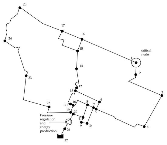 The software operation was validated through the application to the case study analyzed by Fontana et al. [6]. The study compares the results of a skeletonized model of a real WDN (Figure 4) [16], which consists of 26 nodes with demand (nodes 1–26) at a ground elevation of 0 m above sea level connected by 34 pipes and supplied by a reservoir at constant head (i.e., node 27). The PAT, positioned on pipes 26–20 connecting the reservoir to the WDN, was set to maintain a pressure head of 25 m at the critical node which is identified through preliminary hydraulic analysis. This critical node, designated as “node 1,” is determined as the point in the system with the lowest service pressure under typical demand conditions.