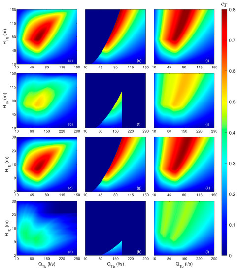 Figure 6 shows the domains obtained for all configurations. For LAY1, Scenario 1 (S1) (Figure 6a) and Scenario 3 (S3) (Figure 6c) show the same shape and similar maximum dimensionless produced energy. The maximum dimensionless produced energy, respectively, = 0.81 for S1 and = 0.79 for S3, was achieved for the same = 58.95 L/s, because of the same flow rate pattern. Similarly, Scenarios 2 (S2) and 4 (S4) (Figure 6b,d) show a similar shape, with maximum dimensionless produced energy of 0.54 for S2, and 0.41 for S4, respectively. Also in this case, the maximum was achieved for the same = 101 L/s.