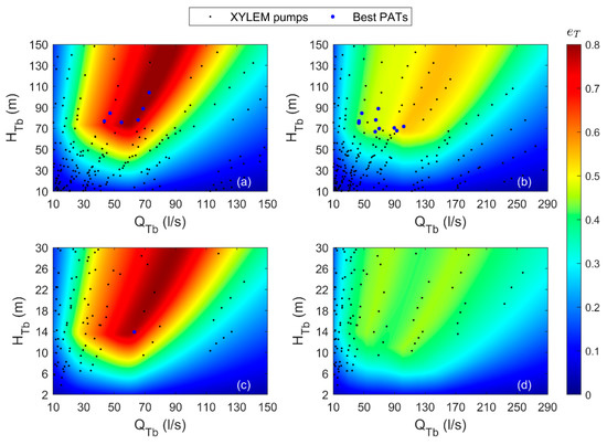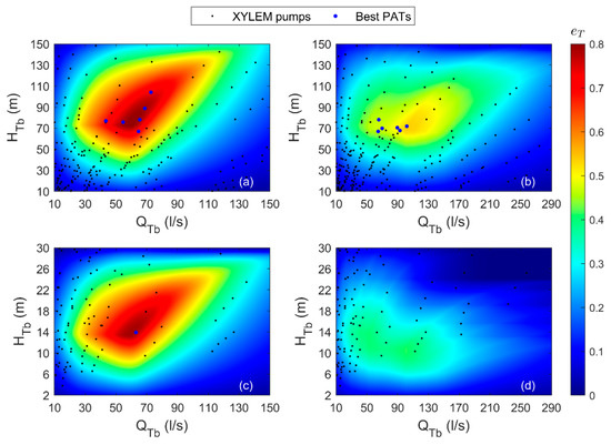 Dimensionless domains were further used to determine the optimal PAT in terms of the produced energy and cost, as selected from a manufacturer’s list of commercially available pumps. As a general remark, the best cost solution is a pump with and close to the maximum . Increasing the values of and raises the total cost, thus making it preferable to select PATs with the lowest and for similar values.