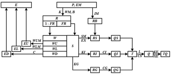 The Xinanjiang model was developed in 1973 and published in 1980 [24,25,26]. Its main feature is the concept of runoff formation on repletion of storage, which means that runoff is not generated until the soil moisture content of the vadose zone reaches field capacity, and thereafter, runoff equals excess rainfall without further loss. This hypothesis was first proposed in the 1960s, and lots of subsequent experiences support its validity for humid and semi-humid regions. According to the original formulation, the runoff generated was separated into two components using Horton’s concept of a final, constant infiltration rate. Infiltrated water was assumed to move into the groundwater storage and the remainder to the ground surface or storm runoff. However, evidence of variability in the final infiltration rate and in the unit hydrograph assumed to connect the storm runoff to the discharge from each sub-basin suggested the necessity of a third component. Guided by the work of Kirkby, an additional component, interflow was provided in the model in 1980. The modified model is now successfully and widely applied in China. The model structure is demonstrated in Figure 1. Detailed descriptions of the principles of the Xinanjiang model can be found in relevant literature.