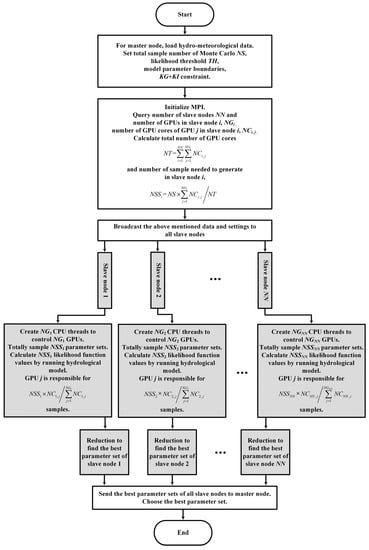 The parallel optimization method starts from the initial settings on the master node. The hydro-meteorological data are loaded from CSV (comma-separated values) files, which include daily rainfall, runoff discharge, evapotranspiration, and the geographical information of the study catchment. The algorithm also sets the total sample number of the Monte Carlo experiment (NS), likelihood threshold (TH), model parameter boundaries, and KG plus KI constraint. After initial data loading and settings, the algorithm begins the MPI execution and queries the number of slave nodes (NN), number of GPUs in each slave node, and number of GPU cores in each slave node by using MPI and CUDA APIs, respectively. The workload quantity assigned to each slave node is calculated as follows: