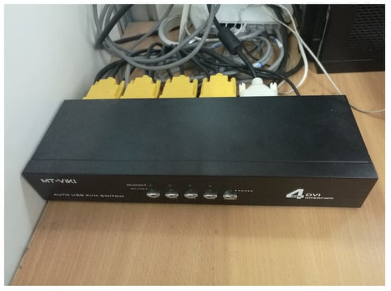 The hardware utilized in this research is a computer cluster composed of one HP Z820 and three HP Z840 workstations. The screen and four workstations are demonstrated in Figure 4. The USB KVM switch, which is used for the controlling and switching of four workstations by one set of screen, keyboard, and mouse, is shown in Figure 5. This computer cluster has five INTEL Xeon E5-2630v3 CPUs and five NVIDIA Tesla K40c GPUs.