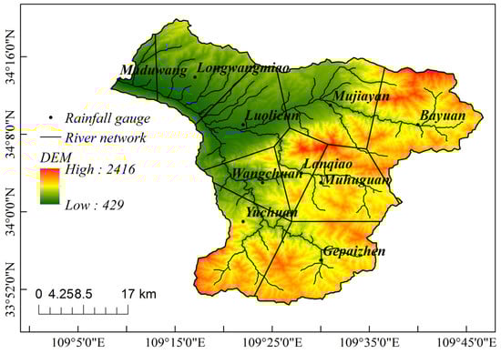 The study area of this research is the Ba River basin. It originates from the north slope of the Qinling, China. The full length of the Ba River is 92.6 km. The elevation difference from the headwater to the outlet of the river is 1142 m. The total slope is 12.8%. The catchment area is 2577 km2. The Ba River basin is an asymmetric watershed. The left bank tributaries are sparse and long, while the right bank tributaries are condensed and short. The Ba River is a mountainous river. The river discharge hydrograph rises and falls steeply. The peak flow usually happens in the summer season, and the drying season is winter. The average annual precipitation of the studied area is 630.9 mm. The average annual evaporation is 949.7 mm. The average annual runoff is 493.1 million m3. There are ten rainfall gauges located in this area and the outlet station is the Maduwang station. Observed daily rainfall, evaporation, and daily average discharges ranging from 2000 to 2010 were utilized as the calibration data set. The map of the Maduwang catchment is demonstrated in Figure 6.
