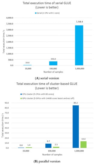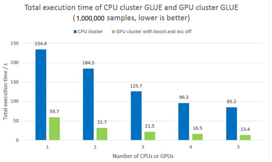 In this section, the scalability of the parallel methods is analyzed based on the total execution time. Here, we focused on the scalability analysis; therefore, we fixed the number of samples to 1,000,000. The GPU cluster turns off the GPU boost and ECC. We varied the number of CPUs or GPUs and tested the total execution time to compare the performances of parallel methods. The total execution time of the CPU cluster parallel version and the GPU cluster parallel version is demonstrated in Figure 9. It can be inferred from the figure that the total execution time of the parallel methods decreases when applying more CPUs or GPUs to accelerate the computation. With more CPUs or GPUs, the computational efficiency of the parallel methods improves significantly. These testing results indicate that the scalability of the parallel method is good, and the parallel method can be applied to highly parallel and heavy computational burden tasks.