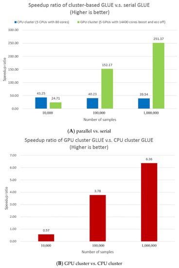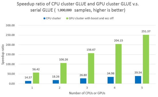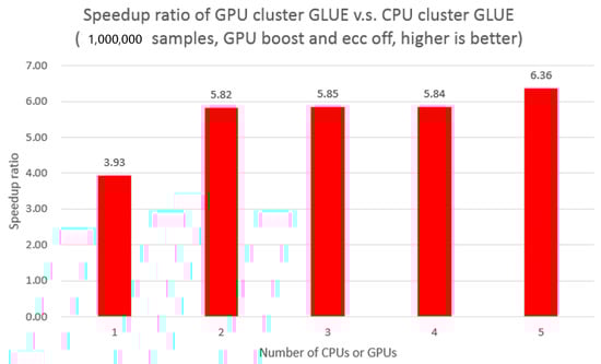 In this section, the scalability of the parallel methods is analyzed based on the speedup ratio between parallel methods. Here, we focused on the scalability analysis by setting the number of samples as 1,000,000. The GPU cluster turns off the GPU boost and ECC. We varied the number of CPUs or GPUs and tested the speedup ratio between parallel methods to compare the performances of parallel optimization methods. The speedup ratio of GPU cluster parallel code vs. CPU cluster parallel code is demonstrated in Figure 11. It can be observed in Figure 11 that the GPU cluster parallel method runs faster than the CPU cluster parallel code when using one to five CPUs or GPUs. The GPU version runs 3.93× to 6.36× faster than the CPU version, which indicates that the GPU cluster parallel code has better scalability than the CPU version. Therefore, adopting more GPUs or CPUs can achieve better computational performance than only using a small number of CPUs or GPUs.