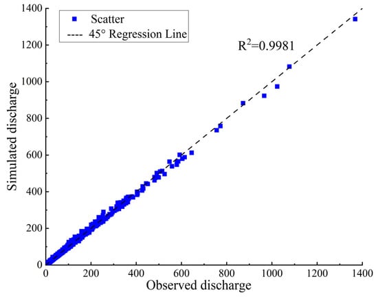 We show a scatter plot of observed and simulated discharge time series in Figure 14. The simulated hydrograph is derived from the optimal model parameter set generated from the parameter optimization method. It is demonstrated that the data points uniformly distribute around the 45-degree regression line, which indicates a very good simulation accuracy of 0.9981 R2 value. The results from Figure 14 show that the proposed model parameter optimization method successfully finds the optimal model parameter and achieves high flood simulation accuracy.