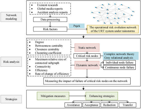 To explore the critical risks and development rules in the evolution of URT systems in rainstorm disasters and clarify the vulnerability of URT systems in rainstorm disasters, this research collects global cases of URT system accidents in rainstorms between 2003 and 2022, selects risk factors, constructs the operational risk evolution network of the URT systems under rainstorms by accident causes, and studies the operational risks of URT systems and their evolutionary relationships by inductive analysis and complex network theory. The research uses Pajek to quantitatively analyze network node characteristics and calculates node importance based on grey relational analysis (GRA) to determine critical risk factors, while it uses the principles of random failure and deliberate attack to simulate the operational risk evolution network of the URT system under rainstorms to explore the changes in the network before and after the failure of critical risk nodes. The results of the research can provide a theoretical basis for the design and layout of safety optimization measures for URT systems and help to improve the resilience of URT systems. The research framework of this paper is shown in Figure 1.