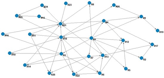 There is a certain causal relationship between risk factors, and each risk factor exists in multiple risk chains; any risk factor may become the cause or result of other risk factors [57,58]. Therefore, the interactions among risk factors can be abstracted as a complex network model, where the connecting lines in the network represent the interaction relationships between risk factors, and the nodes represent the risk factors. According to the constructed adjacency matrix and accident evolution mechanism of the URT system in rainstorms [59], using the Pajek, the lines and nodes constitute the operational risk evolution network of the URT system under rainstorms, as shown in Figure 2.