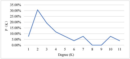 The operational risk evolution network of the URT system under rainstorms consists of 26 nodes and 53 edges. The network has a clustering coefficient of 0.119 and an average path distance of 2.291, which meets the characteristics of the small world. The degree distribution probability is shown in Figure 3. It shows a skewed distribution, which is consistent with the characteristic of the scale-free network. This means that the operational risk evolution network of the URT system under rainstorms is a complex network.