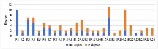 Degree (Ki) is an indicator that describes the local characteristics of the network, indicating the number of other nodes in the complex network that are directly connected to node . The greater (Ki), the greater the correlation between the risk event and other risk events [62]. In a directed network, the degree is the sum of the out-degree and in-degree. The operational risk evolution network of the URT system under rainstorms is a typical directed network, and the degree of exit and degree of entry of a certain risk event reflect the ability and degree of this risk event to cause other risk events in the process of risk evolution, respectively.