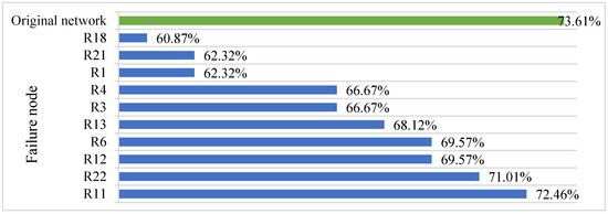 The network efficiency and connectivity are 16.36% and 73.61%, respectively, when the network is static. As a result of the individual node failures, the maximum relative size of the connected subgraph of the network was 96.15%. The network nodes failed in the order of node correlation degree, and the connectivity after a single risk failure is shown in Figure 5. From Figure 5, it can be seen that the network connectivity decreases the fastest after the underground station flooding failure. The reason for this is that the risk of station flooding has a more remarkable ability to trigger and be triggered, and if this risk can be effectively avoided, the safety of the operation of URT systems will be greatly improved.
