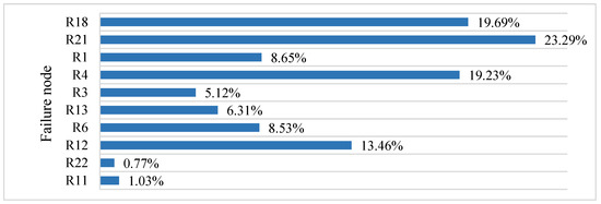 The rate of change in efficiency after the failure of individual nodes is shown in Figure 6. The most significant difference in the efficiency of the whole network is 23.29% after the failure of the train stoppage risk. In the event of rainstorm disasters, once the train stops in the tunnel, it is very likely to cause significant accidents such as train flooding and tailgating, resulting in severe casualties. The second highest rate of change in efficiency in the network is station flooding, which is one of the more critical risks in the operation of URT systems. If station flooding occurs, it may affect the safety of the facilities and equipment and may also pose a threat to the lives of those who are stranded in the station.