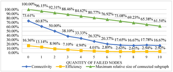 Failure simulation was conducted one by one according to the importance of critical risk nodes. The connectivity, efficiency, and maximum relative size of the connected subgraph of the network are shown in Figure 7. With the increase in the number of failed nodes, the indicators of the network all show a significant downward trend. When the number of failed nodes is six, i.e., when station flooding, train stoppage, heavy rainfall, ponding, flood, and overhead line failure all fail, the ability of risk propagation in the network becomes weaker. Thus, this shows that the failure of the above six risks has the most apparent impact on the whole network in the risk evolution network. Heavy rainfall is unavoidable during rail transit operations. It is of great significance to the safety of rail transit operations under rainstorm disasters if station flooding, train stoppages, ponding, flood, and overhead line failure can be completely avoided.