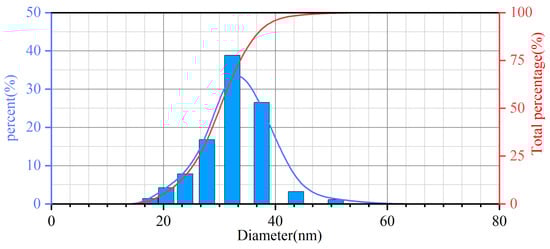 A scanning electron microscope (SEM) image of the MS is shown in Figure 4. The magnetic nanoparticles were uniformly distributed in spherical structures with an average diameter of approximately 35 nm. Particle size analysis of the MS was conducted, and the results are shown in Figure 5. The particle size distribution curve showed a single peak at approximately 35 nm. This indicates that, under the experimental conditions of this study, the particle size of the magnetic nanoparticles was controlled at approximately 35 nm. The ratio of the precipitant to TEOS in the reaction mixture determined the thickness of the Fe3O4 particle coating layer [35]. Studies have also shown that the particle size of nano-adsorbents makes them more selective and that metal oxide adsorbents with particle sizes smaller than 100 nm exhibit better selectivity for Cr (VI). The magnetic nanoparticles synthesized in this study have the advantages of a small particle size, high uniformity, and good selectivity. As shown in Figure 4, the MS particles agglomerated. This phenomenon is due to the magnetic nanoparticles’ high surface area and energy state, which resulted in more significant surface adsorption forces [36]. When the attractive force between atoms or molecules on a surface is greater than the repulsive force caused by the thermal motion [37], they agglomerate to form clusters. Compared with the tubular structure of CAC and the layered structure of BTT, the pore structure of the MS was more obvious, with a more regular shape and a smaller microscale. In addition, the surface chemistry of the MS was conducive to the adsorption of Cr (VI) on its surface.