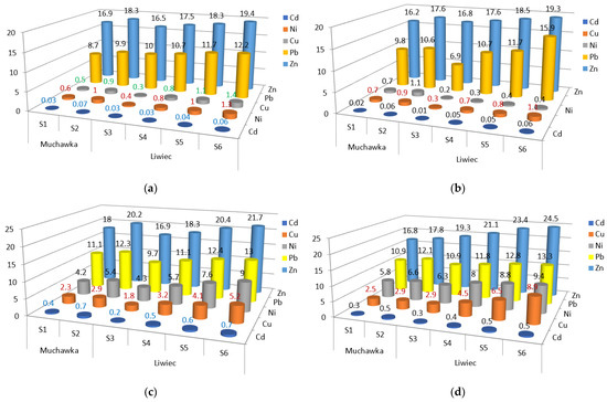 The concentrations of metals detected in surface waters and bottom sediments at the analyzed points are also shown in Figure 4. The variability of metal concentrations (at all sampling points) in both surface waters and bottom sediments was as follows: Zn > Pb > Cu > Ni > Cd.