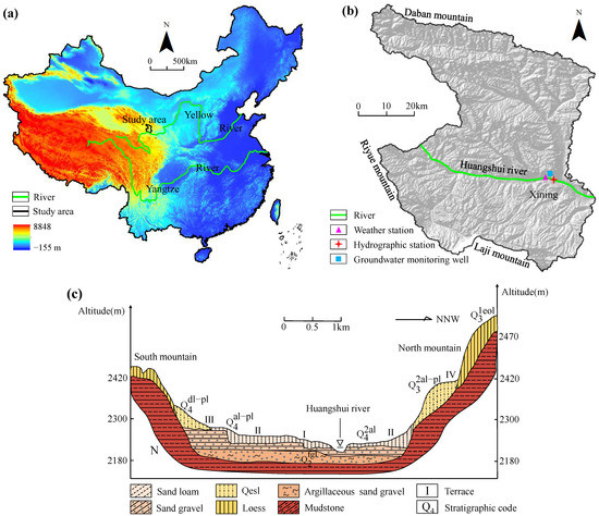 Xining is the city with the largest area, the most concentrated population and the most developed economy on the Tibetan Plateau (in Figure 1a). Its geographical coordinates are 100°58′48″–102°01′26″ east longitude and 36°24′40″–37°03′33″ north latitude. The research area is about 700 km2, with jurisdiction over five districts and two counties. The study area is at the junction of three natural geographical areas, namely, the inland arid area in northwest China, the humid monsoon area in east China, and the alpine region of the Tibetan Plateau. It is also a sensitive ecological environment area responding to nature and human beings [31]. With typical semi-arid plateau continental climate characteristics (mainly cold and dry), the average annual temperature is 5.9 °C, and the average annual evaporation is 1708.4 mm. The average annual precipitation is 393.6 mm, and the annual distribution of precipitation is uneven, with 70% of the rainfall mainly concentrated from July to September [32]. Xining city is located in the middle and upper reaches of the Huangshui River basin, which distributes 56 rivers including the Huangshui River (Figure 1b). The average annual discharge of the Huangshui River is 32.2 m3/s, and the annual discharge in dry and rainy years is 12.5 m3/s and 63.3 m3/s, respectively. The distribution of the river flow is uneven across the year, and the flood season mainly occurs from July to September, accounting for about 70% of the annual runoff [33]. The Quaternary system is widely developed in the study area, mainly including the Middle Pleistocene (Q2), Upper Pleistocene (Q3) and Holocene (Q4), and the underlying stratum is horizontal Tertiary mudstone with sandstone laterite (in Figure 1c). The Quaternary loose rock porewater is widely distributed in the plain area of the Huangshui Valley and the high terraces of the hilly areas on both sides, which is the main type of groundwater in the study area. The groundwater is rich in quantity in the middle and upper reaches of the Huangshui River and its larger tributaries, such as Beichuan River, Xinachuan River and Nanchuan River. Most of these waters are extremely fresh, with a hydrochemical type of HCO3-Ca and TDS of 150–500 mg/L, which are the main water sources for exploitation and utilization in Xining [34].