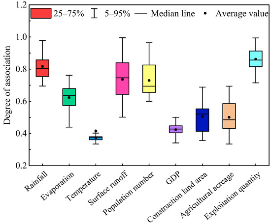 Natural factors (rainfall, evaporation, temperature, surface runoff) and human factors (population number, gross regional domestic product, construction land area, agricultural acreage, groundwater exploitation quantity) were selected as nine driving factors. The grey correlation method was used to analyze the correlation degree between the driving factors and groundwater depth during the period 1980–2020, as shown in Figure 2 and Table 1. As can be seen from Figure 2 and Table 1, the overall correlation was ranked as exploitation quantity (0.862) > rainfall (0.816) > surface runoff (0.756) > population number (0.709) > evaporation (0.623) > construction land area (0.539) > agricultural acreage (0.506) > gross regional domestic product (GDP) (0.429) > temperature (0.373). Among them, the correlation degree of exploitation quantity, rainfall and surface runoff were more than 0.75, indicating that these three factors had a strong correlation with the groundwater depth, further reflecting that the dynamic of groundwater buried depth is influenced by both human and natural factors. The correlation degree of population number, evaporation and groundwater depth is lower than 0.7, and the correlation degree is relatively low. Groundwater is the main source of water supply in Xining city. The increase in the population will inevitably lead to the increase in water demand, so the impact of population on groundwater is mainly reflected in the amount of groundwater extraction. Xining city is a typical semi-arid plateau continental climate, and its evaporation is more intense. When the depth of the groundwater table is less than 5 m, the groundwater is greatly affected by evaporation. However, the buried depth of the groundwater level in this area is about 11 m (>5 m), so evaporation is not considered the main influencing factor of groundwater dynamics. The correlation degree of construction land area, agricultural acreage, GDP and temperature is less than 0.6, which can ignore its influence on the interannual change in groundwater depth. To sum up, the exploitation quantity, rainfall and surface runoff are the main driving factors for the dynamic change in the groundwater depth in Xining city, in which the extraction amount is the main factor and the rainfall and surface runoff are the secondary factors.