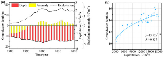 Relationship between groundwater depth and exploitation: (a) groundwater depth and exploitation; (b) correlation of groundwater depth and exploitation quantity.