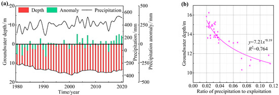 Relationship between groundwater depth and rainfall: (a) groundwater depth and rainfall; (b) groundwater depth and ratio of rainfall to exploitation quantity.