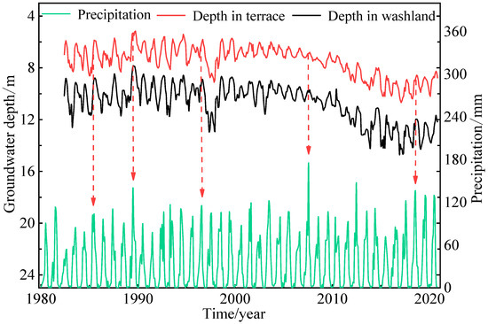 It can be seen from the correlation between the monthly groundwater depth and the rainfall of this month and the previous month in Table 2 that there is a significant negative correlation between the groundwater depth and the rainfall from July to September, while the correlation is weak from October to June of the next year, indicating that the groundwater depth is more sensitive to the response of rainfall in the rainy season. According to the correlation coefficients of different hydrogeological units, the groundwater depth in the floodplain (near the river zone) area has the strongest correlation with rainfall, and the response to rainfall is the most sensitive, followed by the terrace. In addition, the correlation between the groundwater depth and rainfall in the same month is stronger than that of the previous month in the flood plain area, while the correlation between the groundwater depth and rainfall of this month is weaker than that of the previous month in the terrace area, indicating that the lag effect of groundwater on rainfall in the terrace area is more obvious. The main reason is that the terraces are mostly hard impervious interfaces such as construction land or roads under the process of urbanization, which leads to the decrease and delay in effective rainfall recharge. In addition, the influence of human exploitation activities makes the groundwater depth increase, resulting in a thicker aeration zone and more water retention, resulting in a delayed groundwater recharge cycle. Therefore, the rainfall in the study area has a certain recharge lag in terms of the groundwater depth.