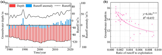 Relationship between groundwater depth and runoff: (a) groundwater depth and runoff; (b) groundwater depth and runoff-to-exploitation ratio.