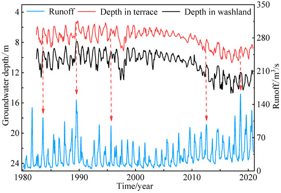 It can be seen from the surface runoff data from January 1980 to December 2020 in Figure 7 that the flow of the Huangshui River presents significant seasonal variation characteristics. The high flow period occurred in from July to September every year with abundant water, accounting for 45.1–75.8% of the annual runoff, and the maximum discharge value was 121.5 m3/s in August 2018. The low flow period from October to June of the next year was small and stable, and the minimum flow was 3.4 m3/s in April 1980. At the same time, it can be seen from the groundwater depth curve that the groundwater depth of the floodplain and terrace also presents an annual periodic change rule, and decreases with the increase in discharge. It is worth noting that the dynamic variation of groundwater depth presents a time-lag characteristic, obviously lagging behind the variation curve of runoff of the Huangshui River. For example, the peak groundwater depth of the floodplain occurred in August 1983, September 1989, September 1997, September 2013 and September 2018, and the peak groundwater depth of the terrace occurred in September 1983, October 1989, October 1997, October 2013 and October 2018. The corresponding peak surface flow was in July 1983, July 1989, July 1997, July 2013 and July 2018. Therefore, the groundwater dynamics in Xining showed a synchronization that lagged behind the surface runoff for 1–4 months. According to the comparison between the groundwater depth curves of the floodplain and terrace in the figure, the annual maximum drop in groundwater depth can reach 3.8 m in the floodplain monitoring wells and 2.6 m in the terrace monitoring wells far from the river, indicating that the farther the distance from the river, the smaller the fluctuation in the groundwater depth with the exploitation amount, and the more delayed the change time.