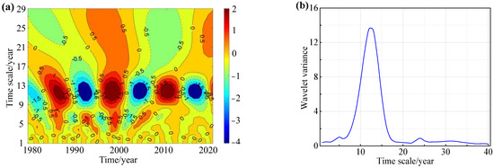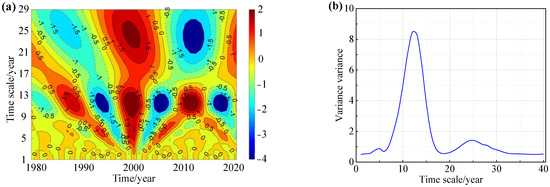 Evolution process of runoff periodicity: (a) time–frequency distribution of wavelet real part; (b) wavelet variance.