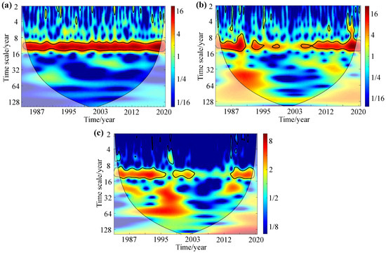 The study of hydrological problems is not only limited to the analysis of multi-scale periodic changes of a single element, but also explores the correlation between different elements under multiple scales. In this section, continuous wavelet transform is used to analyze the periodic evolution characteristics of rainfall, surface runoff and groundwater depth in Xining from 1983 to 2020, as shown in Figure 11. The V-shaped black contour in the figure represents the 95% significance level and the black curve is the wavelet influence cone (COI). The region inside the V-shaped curve (outside the COI) is the valid spectral value, indicating that the oscillation time scale has passed the standard spectrum test of red noise at the significance level of 0.05, while the region outside the curve (inside the COI) represents the invalid spectral value [44]. According to Figure 11a–c, rainfall, surface runoff and groundwater depth within the V-shaped curve range all have a continuous main oscillation period of 12a with strong cohesiveness. It can be seen from Table 3 that, in the time scale of 9–14a, the continuity of rainfall is the strongest among the three sets of sequences, and the distribution of surface runoff and groundwater depth is relatively dispersed. Among them, the whole band of rainfall passes the 95% red noise test, and the distribution outside the COI period is concentrated and has good continuity. The 95% red noise test of surface runoff in 1984–1990, 1992–1996, 1998–2001 and 2004–2018 has strong continuity, and the other periods are scattered. The groundwater depth in the three periods (1984–1996, 1998–2003 and 2013–2018) has strong continuity. Therefore, the groundwater depth in the same section is closely related to the hydraulic power of rainfall and surface runoff.