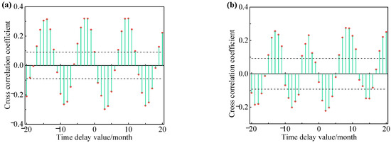 Cross-correlation function (CCF) refers to the correlation degree of two groups of sequence variables at any two moments. The correlation degree of the delay time of different sequences can be obtained by calculating the time difference dislocation movement, which can describe the relationship between the internal correlation degree and the relative lag between sequences [35]. The time corresponding to the first maximum correlation coefficient (peak) represents the time that the input signal lags behind the output signal. Given the homogeneous time series signals Xt and Yt (t = 0, ±1…, ±d, d is the delay time), the cross-correlation coefficient r of Xt at time t and Yt at time t + d is defined as [36,37]: