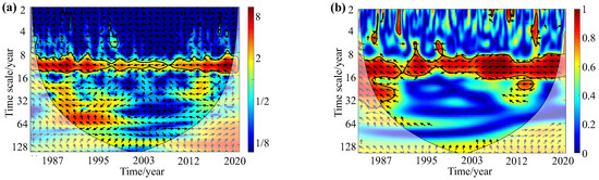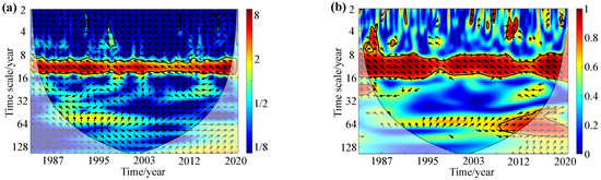 Cross-wavelet transform (CWT) and wavelet transform coherence (WTC) can not only diagnose the similarity between signals and obtain the high and low value regions of their mutual oscillations in the time–frequency domain, but can also analyze the delay time in different frequency scales, thus revealing the same change period regions in the different time scales of the two groups of sequences [43]. Among them, cross-wavelet transform can analyze the phase relationship of the high-energy spectrum region, while the wavelet coherence can analyze the phase relationship in the low-energy spectrum region. Therefore, it is possible to intuitively judge the change details, phase differences, local features and time lag effects of the correlation between the two groups of sequences in the time–frequency domain with different time scales [44]. The calculation principle is to combine complex Morlet wavelets with cross-spectral analysis to carry out cross-wavelet transform and wavelet coherence. The cross-wavelet spectrum of the two time series is defined as: