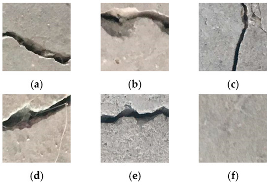 These images were randomly put into the training set and the validation set at a ratio of 8:2. There are two folders under the training set and the validation set: one for collecting positive samples and the other for collecting negative samples, respectively. Some samples with and without cracks are shown in Figure 6. It can be seen that the crack dataset established in this paper contains cracks of various shapes and widths and has good randomness and richness.